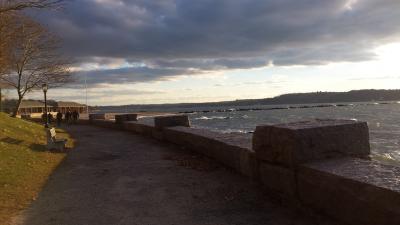 Nach dem Dinner wussten eigentlich alle nicht so recht, ob der Nachtisch, der vom Umfang her dem eigentlichem Essen in nichts nachstand, gleich nachfolgend kommen sollte oder wir erst spazieren gehen sollten. Nach einiger Hektik war der Großteil dick eingemummelt unterwegs und wir wollten einen Abstecher zum Strand machen. Als wir dort ankamen und das eisige Wasser testeten machte der Mann der ältesten Cousine meines Gastvaters seinen Kinder (sind einen Tick jünger als ich) das verlockende Angebot, dass sie hundert Dollar bekommen, wenn sie ins eisige Wasser springen (er ist übrigens Ire und ich hab mir so gedacht, dass sie bestimmt denken, dass alle Europäer so verrückt drauf sind). Nachdem beide schnell reingeprungen waren, habe ich mir gedacht: "Scheiß drauf, dann hast du was zu erzählen". Ich hab meinen verwunderten Gasteltern gesagt, dass sie nichts bezahlen müssen und ich es für Ruhm und Ehre mache, mich bis auf meine Unterhosen ausgezogen und dann ins Meer gestürtzt. Nachher bin ich dann halbnackt wie ich war mit dem Großteil meiner Klamotten in der Hand die Straße entlang gerannt und hab zum Glück nur an den Füßen gefroren. Dabei bin ich noch zwei Fußgängern un einem Auto begegnet, wo der Fahrer mehrmals angefahren und gestoppt ist und anscheinend mit der Situation nichts richtig anzufangen wusste.